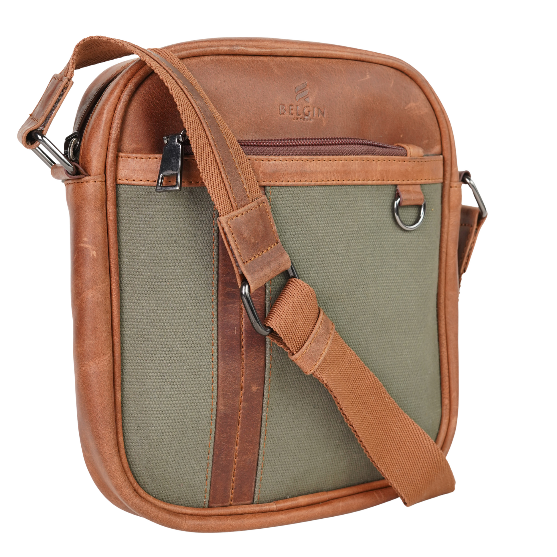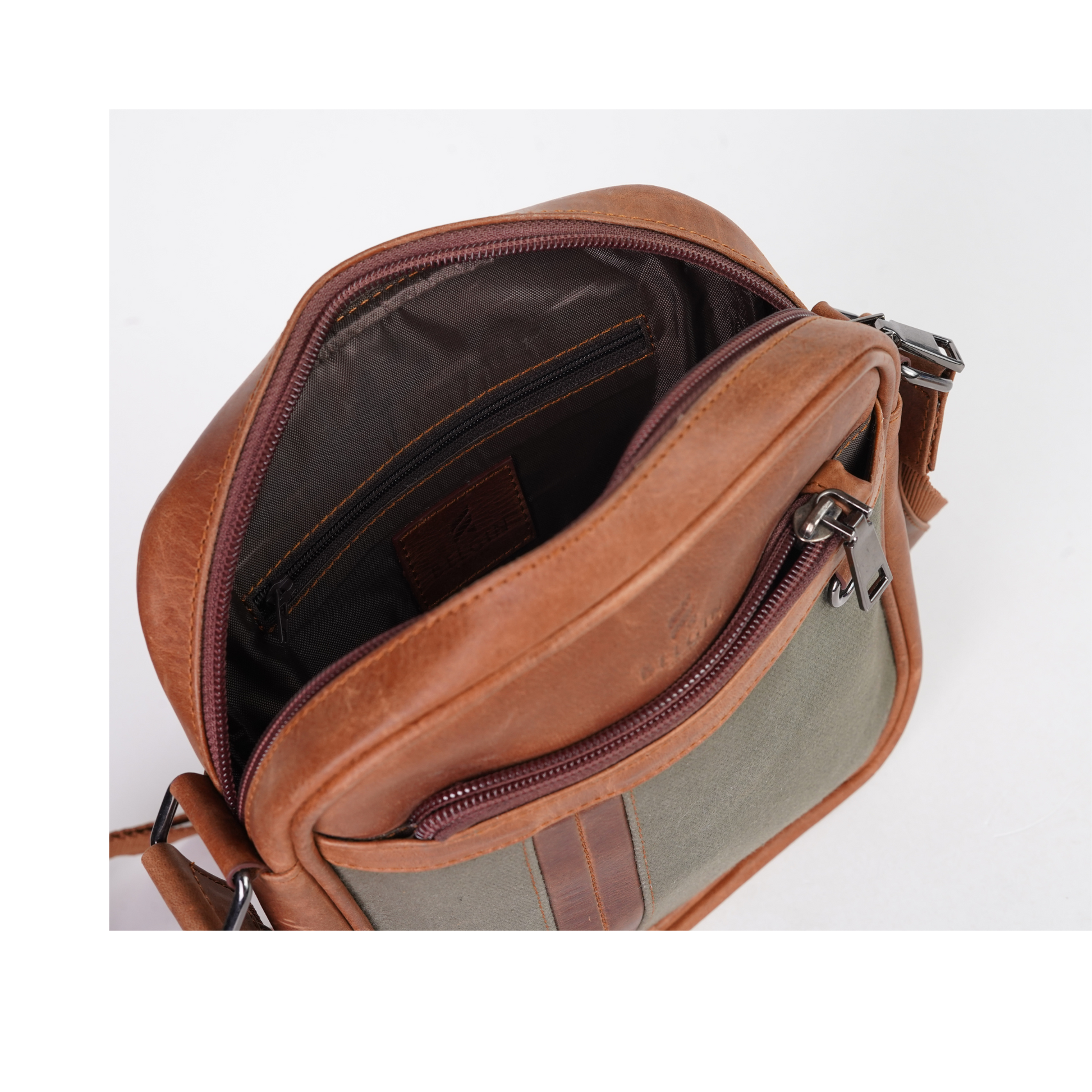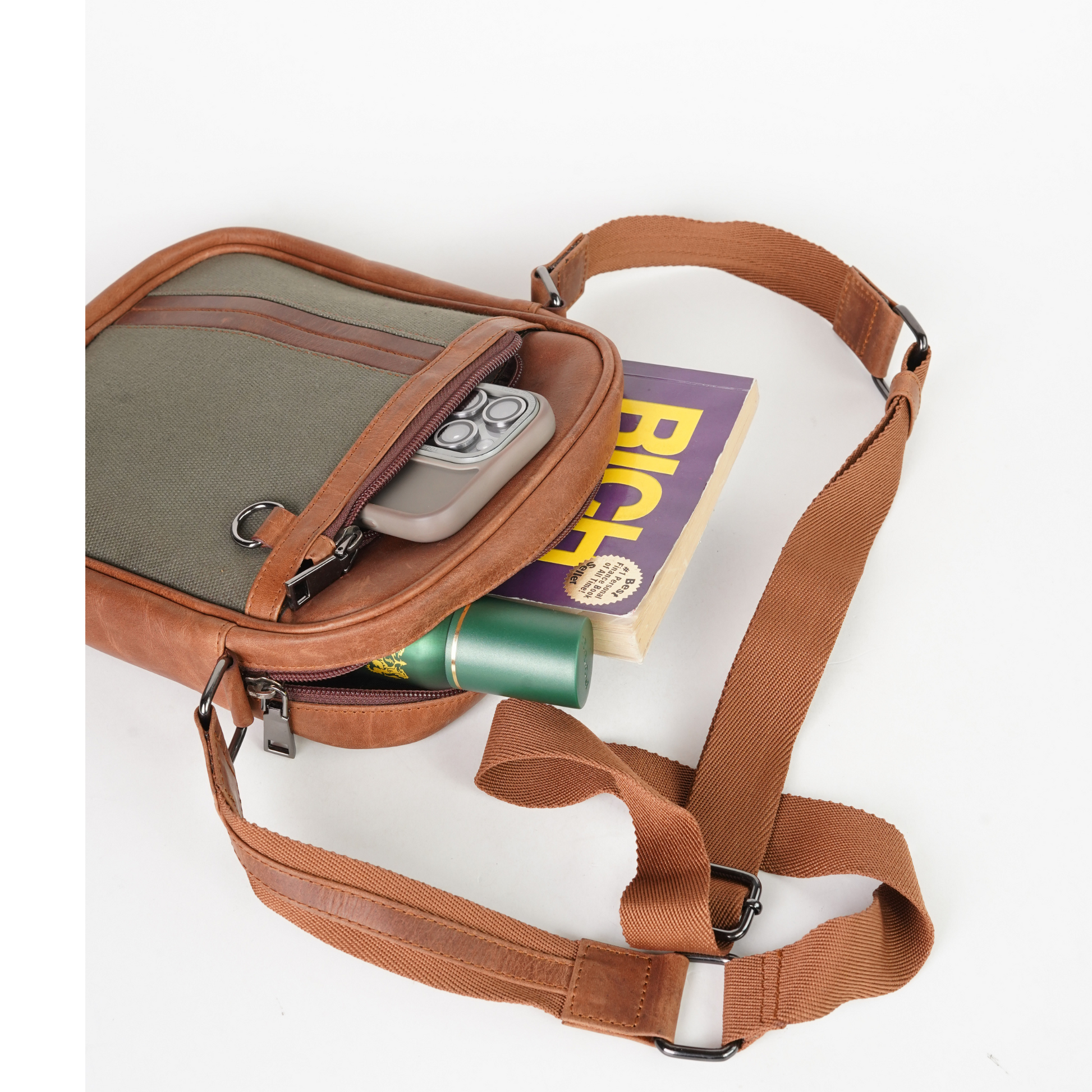 A masterpiece in tan premium full grain leather with olive-washed canvas.