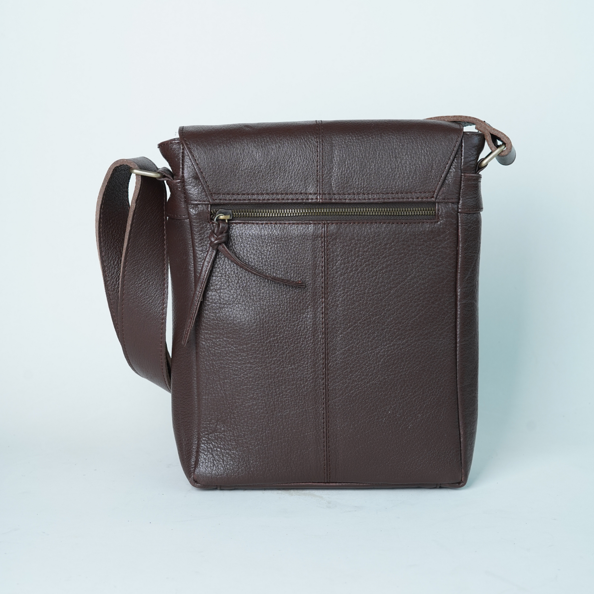 - Premium full grain leather crossbody bag in intense brown color.