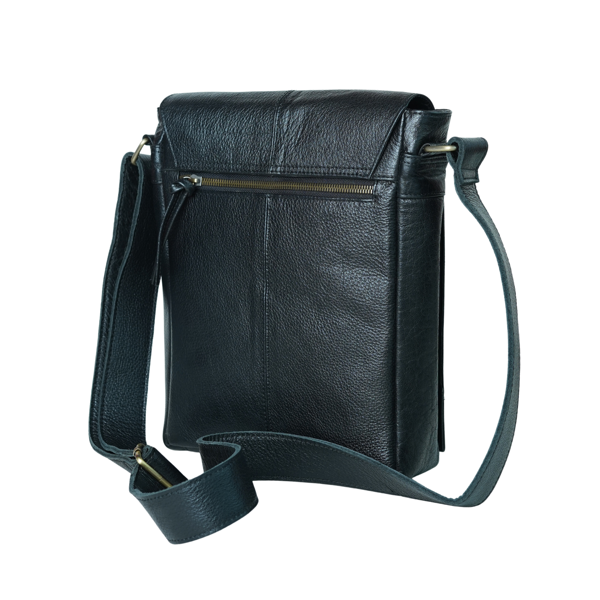 Premium full grain leather crossbody bag in intense brown color. Adjustable leather strap Minimalistic, sleek, and innovative design Leather flap to cover the zipped section Zipped pocket at the back of the bag.