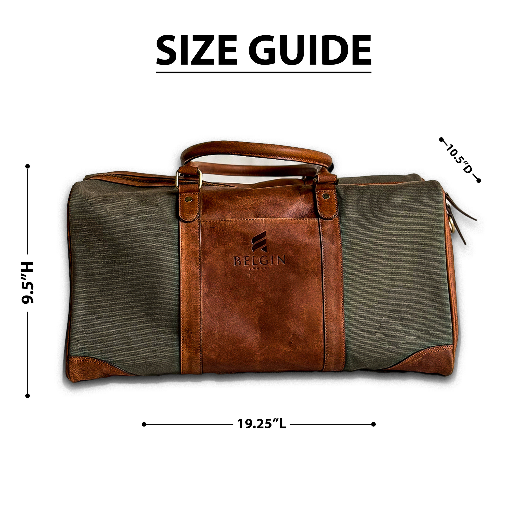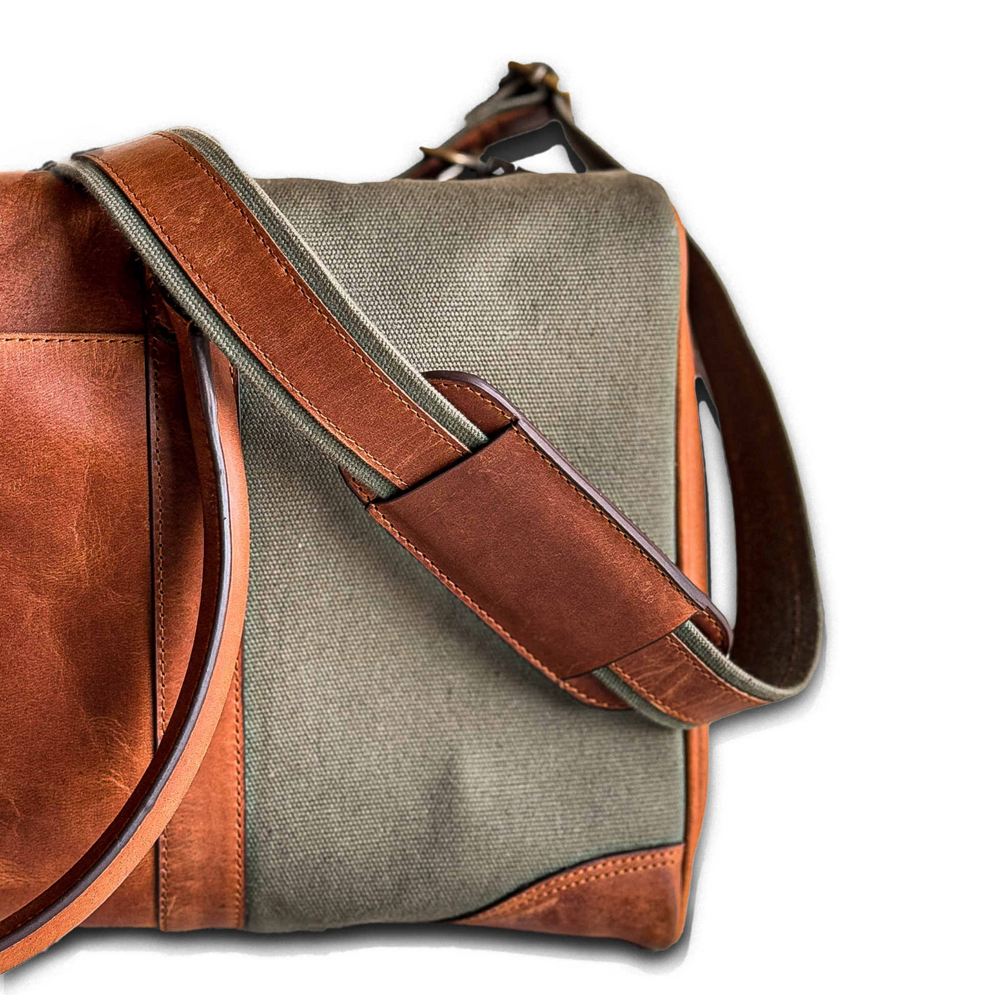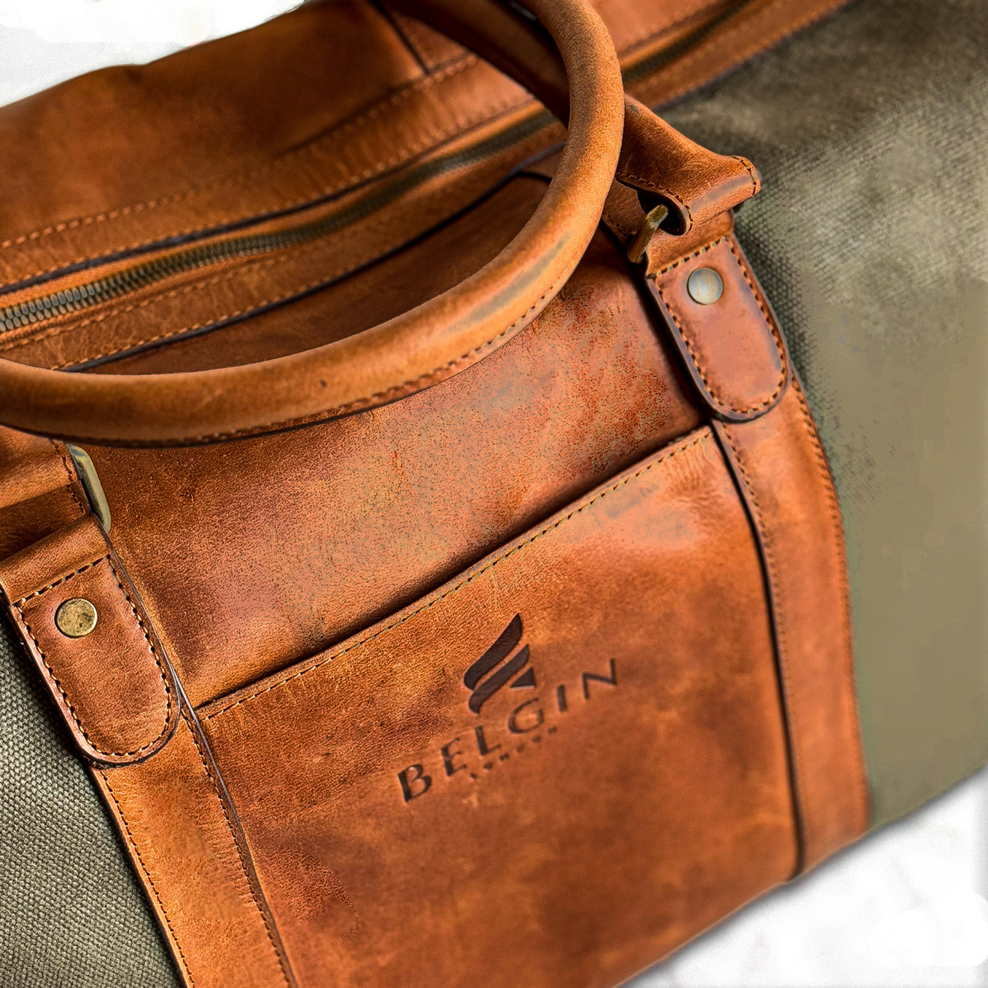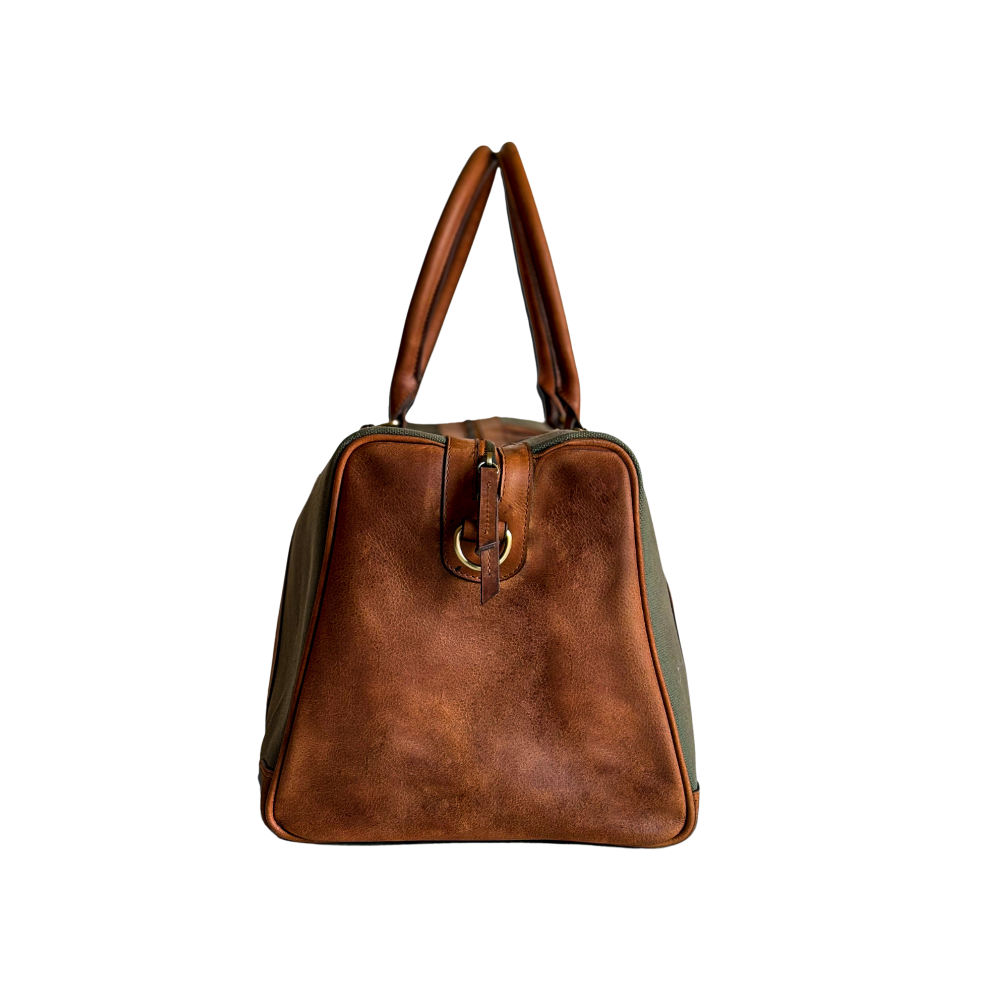 Winston Duffle is a perfect combination of full-grain brown leather and olive green washed canvas, enhancing your look while you carry it to the gym or on trips. This spacious Duffle bag is a valid symbol of elegance, durability, and functionality. Its durable leather, excellent craftsmanship, and metallic hardware give it all that one can rely on. This bag ages beautifully due to its premium quality.
